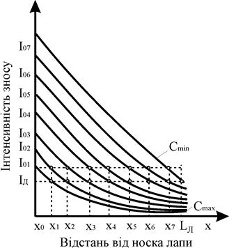 У реальних виробничих умовах лапи експлуатують до зменшення відстані від першого кріпильного отвору до носка – 130 мм, що відповідає зносу 45 мм. Такий гра-ничний знос носка серійних лап досягається при середньому напрацюванні 29 га, а експериментальних – при 42 га.
