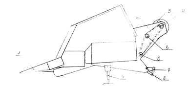 1. лифтер левый, 2. наклонная камера, 3. предохранительная муфта, 4. верхний вал транспортера наклонной камеры, 5. натяжная звездочка, 6. контропривод жатки, 7. ограничитель гидроцилиндра, 8. ось подвески измельчителя, 9. опора жатки.
