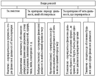 За обслідуваним періодом діяльності ревізії діляться на фронтальні і вибіркові. При фронтальній (повній) ревізії перевіряється вся фінансова діяльність суб'єкта за певний період. Вибіркова (часткова) ревізія являє собою перевірку фінансової діяльності тільки за якийсь обмежений період часу. За обсягом діяльності ревізії поділяються на комплексні і тематичні. При комплексних ревізіях перевіряється фінансова діяльність даного суб'єкта в різних галузях. Тематичні ревізії зводяться до обслідування якоїсь однієї сфери фінансової діяльності.