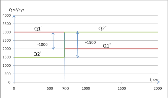 График изменения дебита взаимодействующих водозаборных скважин
