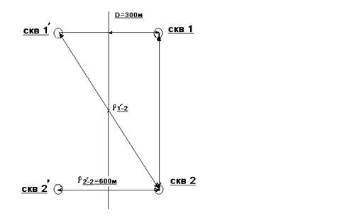Понижение в скважине 2 будет формироваться под воздействием четырех скважин: двух реальных и двух отображенных. Определим расстояние до каждой из них.