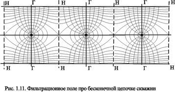 Здесь, как и в кольцевой батарее, имеются главные и нейтральные линии тока, перпендикулярные цепочке. Нейтральными линиями тока вся плоскость течения делится на бесконечное число полос, каждая из которых является полосой влияния одной из скважин, находящейся в середине расстояния между двумя соседними нейтральными линиями. Главные линии тока проходят через центры скважин, параллельно нейтральным линиям.
