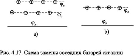 Приведенные формулы тем точнее, чем больше расстояние между батареями по сравнению с половиной расстояния между скважинами. Если расстояние между скважинами много больше расстояния между батареями, то расчет надо вести по общим формулам интерференции скважин или использовать другие виды схематизации течения, например, заменить две близко расположенные соседние батареи скважин с редкими расстояниями между скважинами (рис. 4.17а) эквивалентной одной батареей - с суммарным числом скважин и проведенной посредине (рис.4.17b).