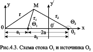 Зависимость (4.2) физически означает, что фильтрационные потоки от работы каждого источника-стока накладываются друг на друга. Т.к. пласт предполагается неограниченным, то потенциал на бесконечности равен бесконечности. В центрах стоков-источников (ri=0) потенциал также равен бесконечности.