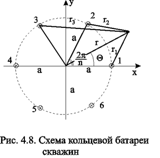 Пусть центры скважин располагаются в вершинах правильного n-угольника, т.к. что скважины образуют кольцевую батарею радиуса а (рис. 4.8). Контур питания удалён от скважин на расстояние, значительно превышающее радиус батареи и тогда можно считать, что все скважины равноудалены от контура питания на расстояние rк. Будем считать, что на контуре питания поддерживается постоянное значение потенциала jк и на контуре скважин потенциал постоянен и равен jс. В данной постановке следовательно надо решить задачу о плоском течении к n точечным стокам, размещённым равномерно на окружности радиуса а. Для получения формулы дебита скважин воспользуемся формулой (4.2)