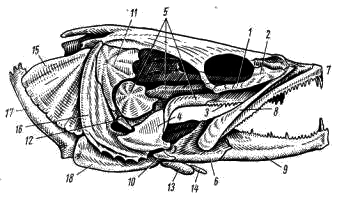 Рис. 5 Череп судака сбоку: 1 — окологлазничные кости, 2— слезная кость, 3 — нёбная кость, 4 — квадратная кость, 5 — крыловидные кости, 6 — сочленовная кость, 7 — предчелюстная кость, 8 — верхнечелюстная кость, 9 — зубная кость, 10 — угловая кость, 11 — подвесок, 12 — симплектикум, 13 — гиоид, 14 — копулагиоида, 15 — крышечная кость, 16 — предкрышечная кость, 17 — подкрышечная кость, 18 — межкрышечная кость