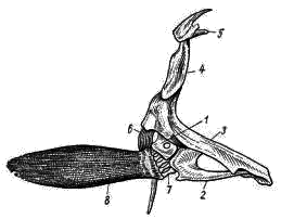 В челюстной дуге можно различить первичные и вторичные челюсти. Первичные челюсти образованы преимущественно замещающими костями и гомологичны хрящам нёбно-квадратному и меккелеву хрящевых рыб. В верхней челюсти они представлены спереди смешанной нёбной костью (palatinum; рис. 5, 3), сзади (в месте сочленения с нижней челюстью) — квадратной костью (quadratum; рис. 5, 4); между ними расположены три крыловидные кости (pterygoideum; рис. 33, 5). Из них лишь одна (задняя крыловидная — metapterygoicieum) замещающая, тогда как остальные две — наружная крыловидная (ectopterygoideum) и внутренняя крыловидная (entopterygoideum) — по происхождению покровные.