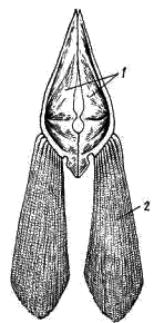 Рис. 7. Тазовый пояс и брюшной плавник судака: 1 — тазовые кости, 2 — кожные костные лучи