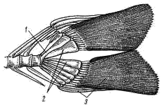 Рис. 8. Хвостовой плавник судака: 1 — конец позвоночного столба — уростиль, 2 — гипуралин, 3 — костные кожные лучи — лепидотрихии