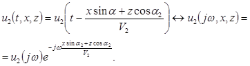 Пусть первичная плоская SH-волна падает на границу (z = 0) под углом α и имеет фронт, параллельный оси Oy. Она описывается вектором смещения , также ориентированным вдоль Оу, но не зависящим от у:
