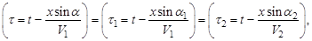 то есть , так как t и x- общие время и координата точки границы, а множители при х равны в соответствии с законом Снеллиуса. Поэтому первое граничное условие дает уравнение:
