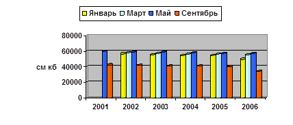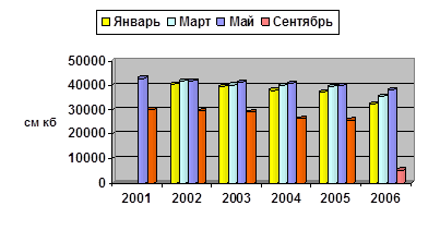 Диаграмма 2 Объем ледяного сталагмита "Заячьи ушки" с 2001 по 2006г.