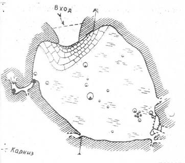 Пещера представлена огромным залом со сводчатыми стенами и потолком. Пол зала почти весь занят ледником. Несколько выпуклая поверхность ледника находится по отношению к входу пещеры на глубине около 20 м. Крутой спуск в зал от входа в пещеру также покрыт покровным льдом (Вахрушев, 1965). По нашим подсчетам в пещере находятся 20 ледяных сталагмитов, высотой более 1 метра, а со стен свисают каменные натечные образования (рис. 2)