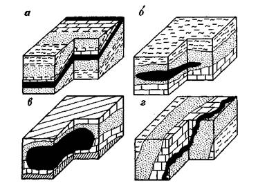 Геолого-промышленный район - часть угольного бассейна, характеризующаяся не только едиными геологическими условиями, но и общностью экономических, географических и исторических особенностей развития. Приведенные определения применимы с соответствующей поправкой к другим полезным ископаемым. Уголь в недрах залегает в виде пластов, руды - в виде жил, линз, гнезд, пластов, а горючие сланцы, соли, торф - в виде пластов и линз (рис. 1.1). Пласт - скопление в недрах полезного ископаемого, ограниченное двумя близкими к параллельным плоскостями и имеющее значительную площадь распространения по сравнению с мощностью (толщиной накопления). Группа пластов, залегающих совместно в порядке их генетического образования, чередующихся с вмещающими пустыми породами и объединяющихся по единому геологическому признаку (чаще всего - по возрасту), представляет собой свиту пластов. Вмещающие породы и свита угольных пластов вместе образуют угленосную толщу. Вмещающие породы, залегающие непосредственно выше пласта, называют кровлей, ниже пласта - почвой. Пластообразное скопление пустой однородной породы или часть пласта называют слоем.