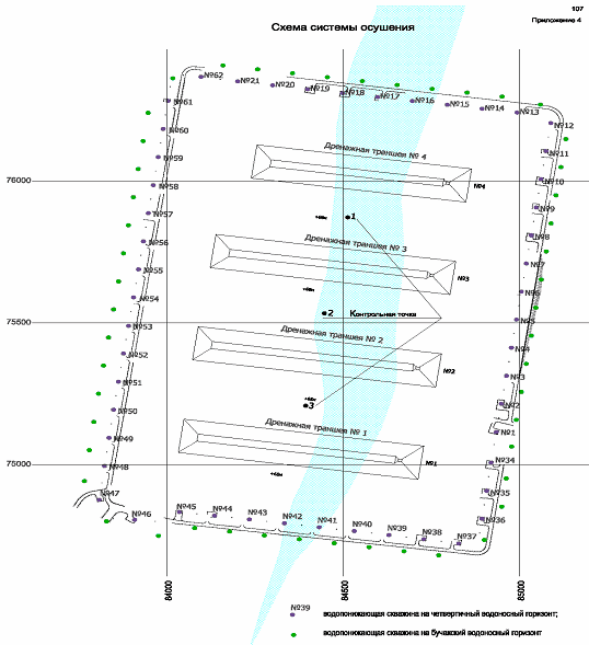 План расположения объектов системы осушения указан в приложении 4. Очередность вскрытия и темпы углубления дренажных траншей приведены в приложении 5.