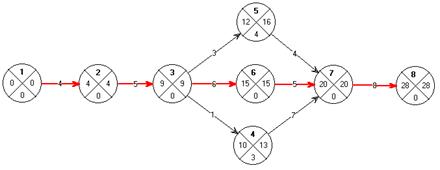 Критический путь – 1,2,3,6,7,8 = 28 суток - максимальный по продолжительности полный путь.