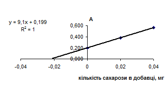 Порівняні результати визначення цукрів двома фотометричними методами. Зроблена оцінка збіжності, відтворюваності та правильності результатів методом „введено-знайдено”, Sr=0,01.