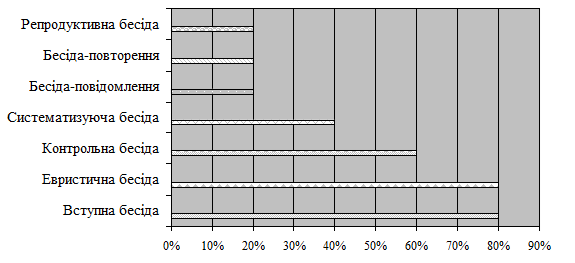 В навчально - виховному процесі бесіда відіграє важливу роль. Під час проведення бесіди учні вступають в діалог з вчителем, а для цього необхідно використати їм свій досвід, засвоєні раніше знання (в школі чи в позашкільний час). В ході такого діалогу учні намагаються обґрунтувати, перевірити чи довести те завдання, яке перед ними ставиться. Під час бесіди діти можуть відкривати щось нове, зіставляти відоме і невідоме, здобувати нові знання [18, с. 194]. Разом з тим, бесіда дозволяє активізувати учнів під час уроку, пригадати раніше засвоєний матеріал, повторити, закріпити чи вивчити нову тему. За допомогою бесіди можна залучити учнів до активного обговорення поставленого завдання.