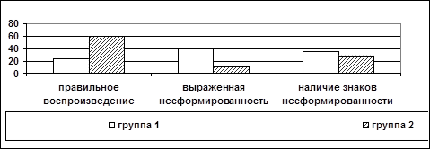 У детей 1 группы, отмеченные выше процессы также входят в систему со слухоречевой памятью, но их роль не так значительна. В этом возрасте, все еще, большую роль играет механическое неопосредствованное запоминание, также здесь просматривается тесная взаимосвязь памяти с процессами восприятия слуховой модальности, сформированность несформированностью сферы предметных образов-представлений и номинативной речи, сформированность несформированностью мотивационно-потребностной сферы, а также возможностями общей модуляции активности коры головного мозга ребенка.