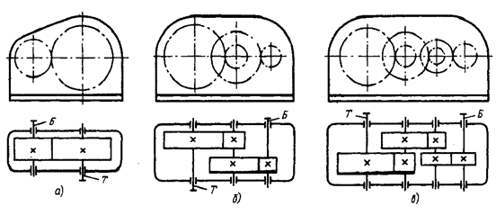 Трехступенчатые редукторы типа ЦЗУ и др. имеют развернутую схему расположения колес. Используются также трехступенчатые редукторы с раздвоенной второй ступенью.