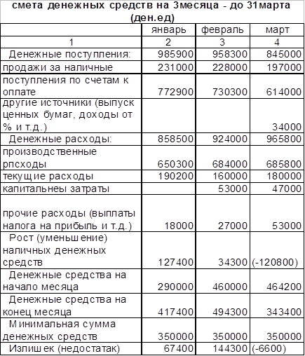 Сложить величины чистого денежного потока и денежные средства на начало периода. Если сумма более 0, то предприятие имеет все для удовлетворения своих потребностей в течение периода бюджета (если все оценки правильны). Если сумма менее 0, то предприятие должно найти способ покрыть разницу.