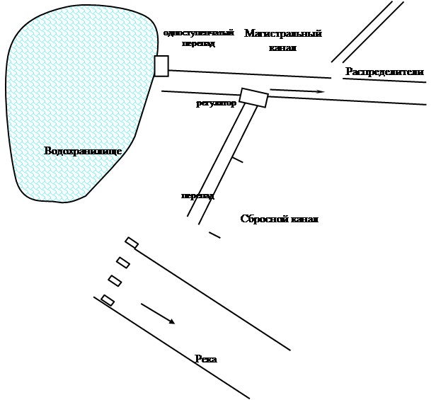 Магистральный канал подает воду на орошение и обводнение подкомандной ему территории. От магистрального канала отходит сбросной канал, в головной части которого устраивается регулятор. На сбросном канале предусматривается сооружение многоступенчатого перепада.