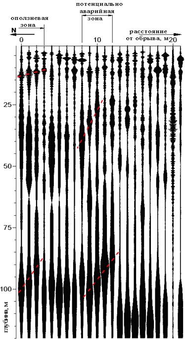 Проверка этой идеи была осуществлена на берегу Азовского моря, вблизи Темрюка. На рис.1 приведен ССП-разрез, полученный вдоль профиля, расположенного от обрывистого берега моря вглубь материка. Разрез характеризуется в целом наличием нескольких воронкообразных объектов, причем только с одной образующей. На глубине около 100м залегает известняковая плита, для которой характерно наличие косых границ вследствие ее излома. Одна из таких границ выявлена непосредственно у обрыва (0-3 м профиля). Тангенс ее угла наклона равен 10 (угол равен 84°), то есть положение плиты почти вертикально. Вышележащий массив на данном отрезке профиля наследует этот излом, о чем свидетельствует наличие более пологой границы на глубине около 12м. Тангенс ее угла наклона равен 0,77 (угол равен 38°). При динамическом воздействии на массив вблизи обрыва рано или поздно оползень произойдет.
