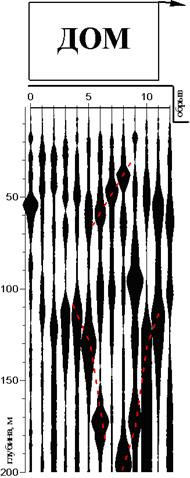 Постоянное динамическое воздействие на структуру обеспечивается со стороны прибоя. Если начать строительство вблизи обрыва, то динамическое воздействие со стороны строительной техники резко ускорит сползание грунта. На участке 8-12м профиля на глубинах 35 и 90м присутствуют практические такие же образующие воронкообразных объектов. Однако обрыв к 8-му профиля никогда не приблизится, поскольку на участке 4-8м оползнеопасных поверхностей скольжения нет. И поэтому участок 8-12м неоползневоопасный, и имеет обычные свойства, характерные для зон тектонических нарушений (ЗТН) [2]. То есть, фундамент в этой зоне будет разрушаться и уходить в грунт. Далеко не все участки, находящиеся около обрывов, являются оползнеопасными, и в этом их коварство. Так, в Пятигорске многие дома построены на краю обрывов. Они стоят много лет, и нет никаких признаков того, что они могут поползти. Иначе получилось с домом N79 по ул. Февральской. Построенный на краю обрыва в 70-х годах, этот 9-этажный панельный дом несколько лет назад начал показывать признаки разрушения. Дом стал наклоняться в сторону, показанную стрелкой, стали разрушаться его опорные панели, и под домом со стороны обрыва местами стал уходить грунт. На рис.2 приведен ССП-разрез, полученный при профилировании в направлении обрыва, рядом с торцом этого дома. Плоскости скольжения здесь не видно, но под самым краем обрыва прорисовался четкий V-образный объект. То есть, непосредственно на краю обрыва находится зона тектонического нарушения. Сразу становится понятным механизм процесса разрушения дома. За время существования дома зона нарушенности пород, свойственная ЗТН, поднялась до поверхности, и стала уменьшаться несущая способность грунта.