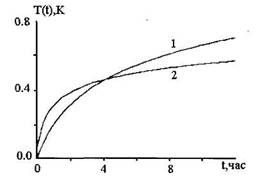 Рис.2.6. Изменение во времени дроссельной температурной аномалии в интервале притока нефти (кр.1) и воды (кр.2). Удельный дебит нефти 1 м3
