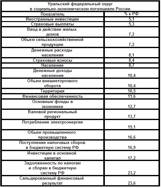 Во-первых, по большинству параметров Урал сохранил достаточно весомые позиции в Российской Федерации. Регион по-прежнему выступает одним из локомотивов развития экономического, оборонного и научного потенциала страны(см. табл. 1).