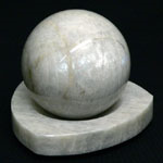 Непрозрачный белый лунный камень с иризацией в серых и сине-голубых тонах, возникающей при отражении света от плоскости спайности под углом 12–15 градусов. Нахождение – микроклин-олигоклазовые гранитные пегматиты мусковитовой формации (гранат, турмалин, апатит, кварц, мусковит).