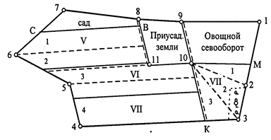 - на пахотных землях южной части землепользования — пятипольный овощной севооборот, сад, три поля полевого севооборота и полевые дороги.