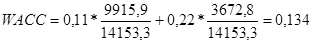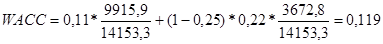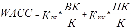 Вартість капіталу в нашому випадку розрахуємо на основі середньозваженої вартості капіталу ( WACC) за наступною формулою: