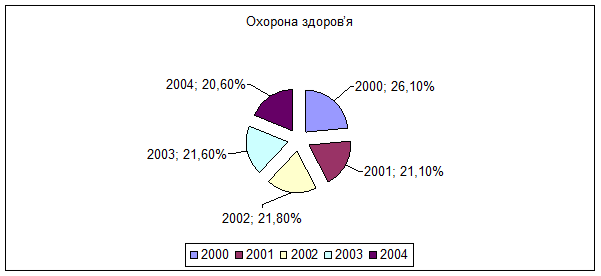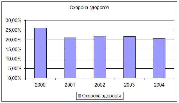 За розрахунками регіонального соціального бюджету області, витрати на охорону здоров'я протягом 2000 - 2004 років зросли. Так у 2000 році вони склали 296 млн.грн., а у 2004 році складають майже в три рази більше – 640 млн.грн. Але якщо розглянути виплати цієї частини витрат в процентах до видатків бюджету, то спостерігається падіння протягом всього періоду. Як видно на рисунку 2 це значення в2000 році дорівнювало 26 %, а в 2004 році вже 20%.