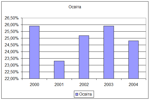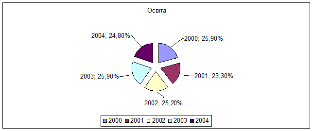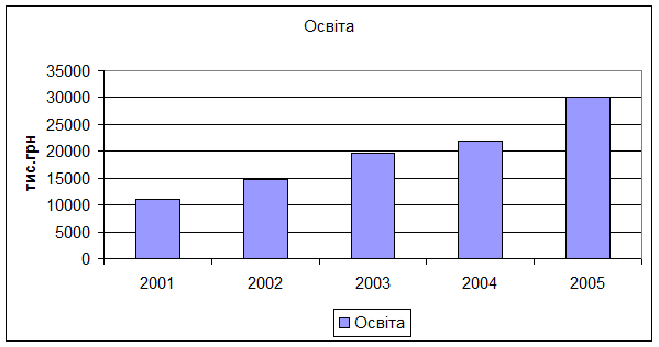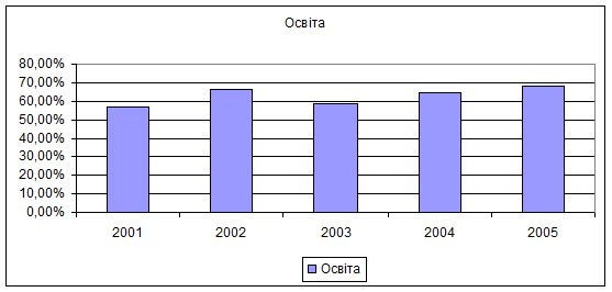 Найбільшу питому вагу мають видатки на освіту .Протягом 2001-2005рр.ці видатки мали тенденцію до зростання .Структура видатків на освіту за економічною класифікацією теж має тенденцію зростання.В порівнянні з 2001р.у 2005р.видатки на освіту зросли майже втричі.