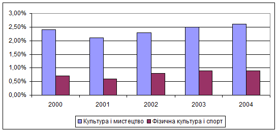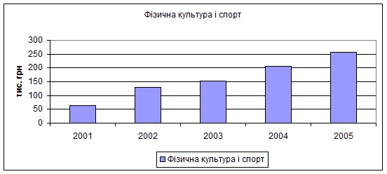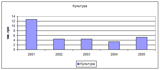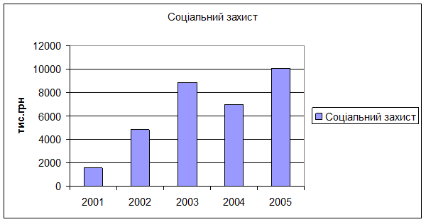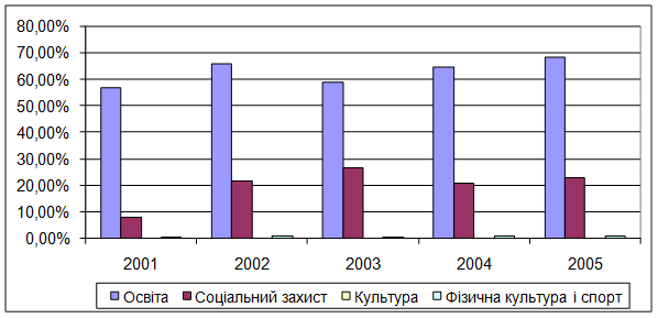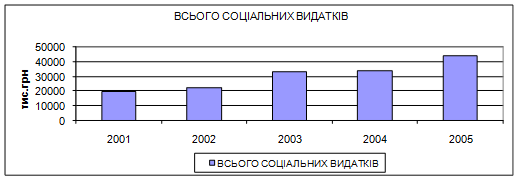 . За 2005 рік сума соціальних видатків склала 440770 тис.грн. Слід зазначити, що ці соціальні видатки мали зростаючу тенденцію протягом 2001- 2005років. Лише видатки на культуру зменшувалися (2001р.-13,0тис.грн., 2004р.-3,0тис.грн.,і тільки у 2005 році вони дещо підвищилися – 5,0 тис.грн.).