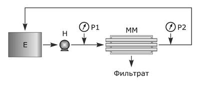 3. Модуль обратноосмотического обессоливания. Осветленная вода после отстаивания в емкости Е5 самотеком подавалась через фильтр сетчатый Ф2 в емкость Е6 узла обратноосмотической очистки. В целях защиты мембраны от воздействия остаточного активного хлора, образующегося на узле электрофлотодеструкции, проводилась операция дехлорирования воды. С этой целью из емкости Е7 дозирующим насосом НД4 в трубопровод подавался 2% раствор пиросульфита (или сульфита) натрия. Из емкости Е6 осветленные и очищенные от фенола сточные воды насосом.Н2 подавались на обратноосмотический мембранный модуль ООМ, укомплектованный высокоселективным обратноосмотическим мембранным элементом. Очищенная вода возвращалась в производство. Концентрат поступал в емкость Е6 и по окончании концентрирования (достижения заданной концентрации солей, контроль по ручному солемеру типа DIST) он подлежал утилизации или выпариванию с получением твердых кристаллов солей. На линии фильтрата и концентрата были установлены расходомеры F2, F3 соответственно. На линии выхода концентрата из мембранного модуля был установлен манометр Р для контроля рабочего давления.