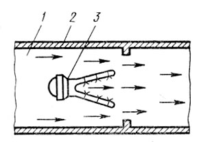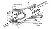 Если температура выбросов недостаточна для протекания окислительных процессов, то в потоке отходящих газов сжигают природный или какой-либо другой высококалорийный газ. Одним из простейших устройств, используемых для огневого обезвреживания технологических и вентиляционных выбросов, является горелка, предназначенная для сжигания природного газа (рис. 3). Обезвреживаемые выбросы в этом случае подаются в канал 1, где они омывают горелку 2. Из коллектора 3 газ, служащий топливом, поступает в сопла, при истечении из которых инжектируется первичный воздух из окружающей среды. Горение смеси газа с первичным воздухом осуществляется в V-образной полости коллектора. Процесс догорания происходит на выходе из полости, где хвостовая часть факела контактирует с обезвреживаемыми выбросами при их истечении из кольцевой щели между корпусом горелки и коллектора.