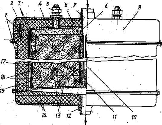 На рис. 1 показана схема адсорбционно-каталитического фильтра для обезвреживания некоторых токсичных органических веществ (аминов, гидразина и его производных). Шихта представляет собой алюмосиликатный меднохромовый адсорбент-катализатор. Масса шихты в аппарате 50 кг, что позволяет задерживать в зависимости от условий фильтрации 5-10 кг токсичных веществ, например, метилового спирта, формальдегида и др.; максимальная температура при окислении кислородом воздуха достигает 530 °С. Фильтр представляет собой корпус 14 с коаксиально размещенной в нем кассетой 3,, содержащей центральный вводной перфорированный трубопровод 8, который соединен с газоподводящим трубопроводом 7, имеющем на наружной поверхности прорези 10, охватываемые металлической сеткой 6. На образующей 17 цилиндрической кассеты 3 выполнены отверстия 16, армированные металлической сеткой 13. Газоотводящий трубопровод 12 размещен в донной части корпуса 14. Корпус 14 защищен теплоизолирующим слоем 2 и имеет съемный кожух 1. В верхней части фильтра находится штуцер 5 для засыпки или ссыпки адсорбента-катализатора. Кассета 3 монтируется съемной относительно корпуса 14.