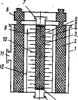На рис. 2 показана схема такого дополнительного проточно-каталитического фильтра, обеспечивающего доочистку газовых сред, выходящих из адсорбционно-каталитического аппарата. Шихта этого фильтра также представляет собой алюмосиликатный медно-хромовый адсорбент-катализатор, но его масса на порядок меньше, чем масса шихты основного аппарата. Конфузорная 11, цилиндрическая 7 и дифузорная 9 части аппарата разделены сетками 1. На электроизоляции 5 корпуса 2, ограниченного снаружи герметичной камерой 6 с теплоизоляцией 12, имеется устройство 10 для подогрева шихты, например электронагревательная спираль 8. Кроме того, в конфузорной части 11 имеется распределительное газовое устройство 3, соединенное с газоподводящим трубопроводом 4.