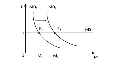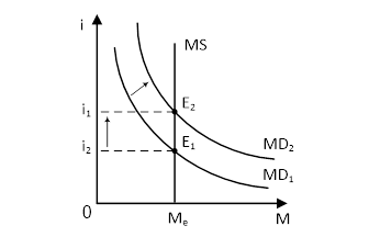 Рост спроса на деньгивызывает рост ставки процента, т.к. обращаясь за кредитами или продавая ценные бумаги, население способствует ее повышению, ввиду того, что при неизменном предложении денег растущий спрос может быть ограничен только таким образом.