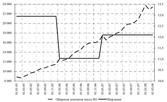 Широкая денежная масса на 1 апреля 2008 г. составила 24,98 трлн. рублей, а за январь 2008 г. сократилась на 3,7%, или на 0,89 трлн. рублей. Скорость обращения широкой денежной массы в среднегодовом исчислении с 1 февраля 2008 г. снизилась на 7,3% до 5 оборотов. В структуре широкой денежной массы доля рублевой денежной массы на 1 января 2008 года составила 64,7%. [11]