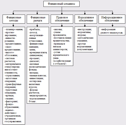 Правовое обеспечение функционирования финансового механизма включает законодательные акты, постановления, приказы, циркулярные письма и другие правовые документы органов управления.