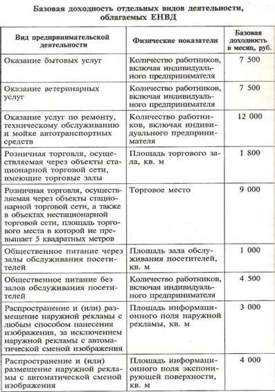 Налоговой базой для исчисления суммы единого налога признается величина вмененного дохода, рассчитываемая как произведение базовой доходности по определенному виду предпринимательской деятельности, исчисленной за налоговый период, и величины физического показателя, характеризующего данный вид деятельности.
