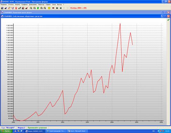 Величина собственных оборотных средств возрастает в процессе производства неравномерно, постоянно происходят колебания кривой собственных оборотных средств, а в 1 квартале 2004 года происходит резкое увеличение собственных оборотных средств, примерно с 780 0000 руб. до 1 600 000 руб., но уже в конце 2 квартала происходит резкое уменьшение собственных оборотных средств. Положительным фактом является то, что на протяжении всего периода величина собственных оборотных средств не принимала отрицательного значения.