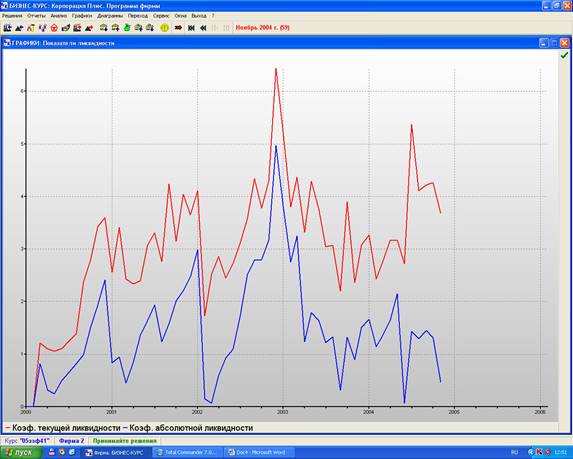 Коэффициент текущей ликвидности должен равняться 2, а коэффициент абсолютной ликвидности должен быть не менее 0,15. Таким образом, на протяжении всего производственного процесса коэффициент текущей ликвидности соответствовал нормативу, кроме 1 и 2 квартала 2000 года; 1 квартала 2002 года. Коэффициент абсолютной ликвидности подходил к 0 только в 1 квартале 2002 года и 2 квартале 2004 года.