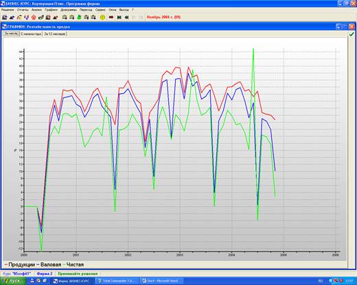 Показатель чистой рентабельности продаж на протяжении всего производственного процесса должен быть ниже валовой рентабельности, что в нашем случае учитывается, за исключением. В основном этот показатель выше 0, за исключением 2 квартала 2000 года, 4 квартала 2001 года и 2 квартала 2004 года, что говорит о том, что в эти периоды фирма несла убытки.