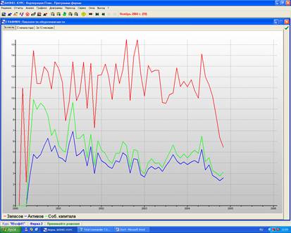 Из графика видно, что оборачиваемость запасов выше оборачиваемости собственного капитала, а оборачиваемость собственного капитала выше оборачиваемости активов и это происходит на протяжении всего производственного процесса. Таким образом, сохраняется стабильность в производстве, что свидетельствует о положительной динамике оборачиваемости.