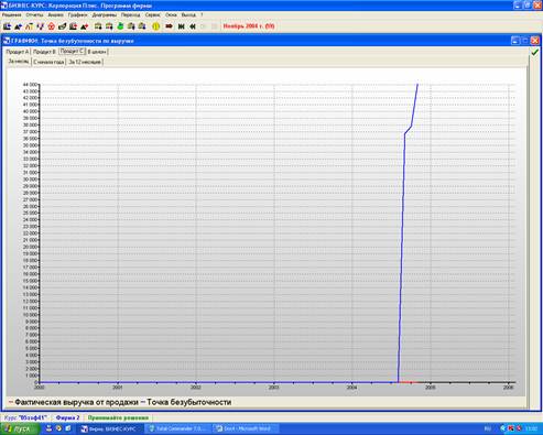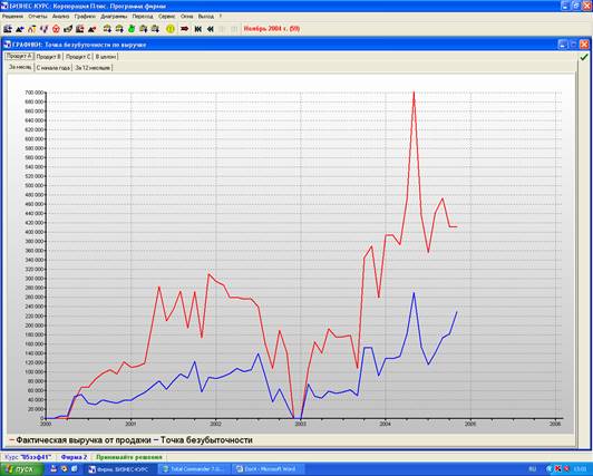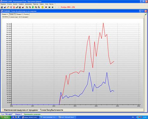 Фактическая выручка от продажи продукции В на протяжении всего производственного процесса выше точки безубыточности по выручке, что говорит о том что производство товара В приносит прибыль. Фактическая выручка от продаж на протяжении всего производственного процесса то возрастала, то резко снижалась, наивысшей точки она достигла в 2 квартале 2004 года.