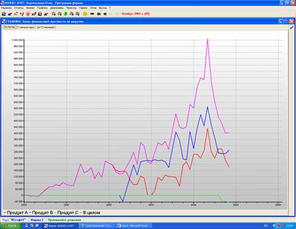 Фактическая выручка от продажи продукции А на протяжении всего производственного процесса выше точки безубыточности по выручке, что говорит о том что производство товара А приносило прибыль, кроме 1 квартала 2000 года и 4 квартала 2002 года, где фирмой был получен убыток. Фактическая выручка от продаж на протяжении всего производственного процесса то возрастала, то резко снижалась, наивысшей точки она достигла в 2 квартале 2004 года.